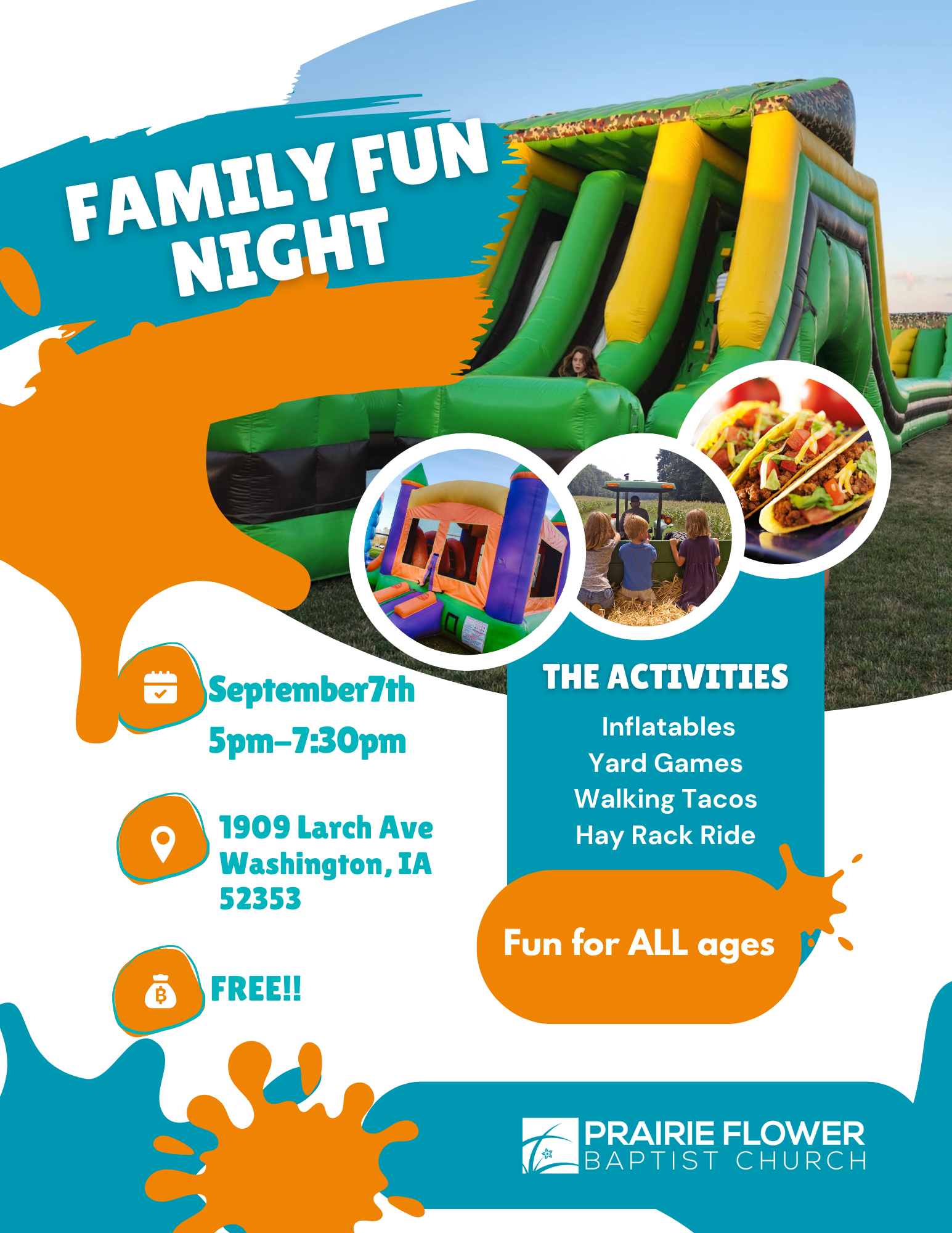 Join us on September 7th, from 5:00-7:30pm. We will have food, inflatables, games, and a hay ride. All visitors welcome.